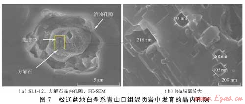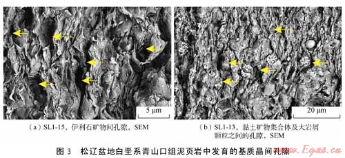 利用掃描電鏡和場發(fā)射掃描電鏡二次電子成像技術對松遼盆地主要生油層白堊系青山口組泥頁巖中發(fā)育的孔隙和微裂縫進行了系統(tǒng)的成像觀察,發(fā)現(xiàn)該套頁巖中主要發(fā)育了5種類型孔隙即基質(zhì)晶間孔、有機質(zhì)孔、溶蝕孔、粒間孔、晶內(nèi)孔及微米—亞微米級(納米級)微裂縫,微裂縫包括充填縫、溶蝕縫及層間縫。各種類型孔隙與微裂縫伴生發(fā)育,并可能彼此連通。這種復雜微裂縫網(wǎng)絡-孔隙系統(tǒng)的存在為油氣從烴源巖向外排驅(qū)提供了有效通道,同時也為滯留在泥頁巖中的部分油氣提供了有效的儲集空間。該套地層中各類型孔隙尺寸為納米—微米級,可能主要受頁巖基質(zhì)的微觀孔隙結(jié)構(gòu)、礦物組成、有機質(zhì)類型以及有機質(zhì)的熱演化程度等因素的影響。