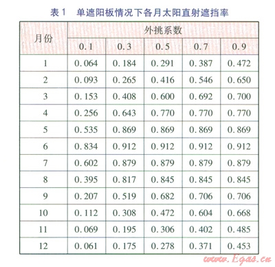 ①單純考慮太陽(yáng)直射輻射時(shí),單遮陽(yáng)板的外挑系數(shù)宜控制在0.3左右。