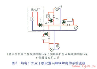 熱電廠外支干線設(shè)置尖峰鍋爐房(系統(tǒng)流程見圖5)。由圖5可知,與設(shè)置在熱電廠外主干線的峰荷熱源不同之處為尖峰鍋爐房設(shè)置在熱網(wǎng)的支干線上,尖峰鍋爐房負(fù)責(zé)某個(gè)分支的尖峰熱負(fù)荷。尖峰鍋爐房可以新建,也可以利用原有小區(qū)的供熱鍋爐房。對(duì)于這種設(shè)置方式,峰荷熱源的投資、運(yùn)營方均為供熱公司。