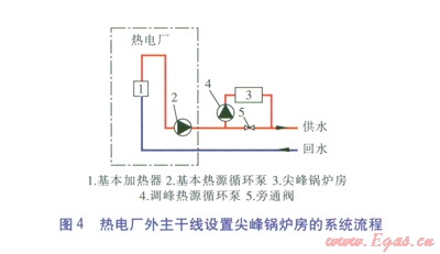 熱電廠外主干線設(shè)置尖峰鍋爐房(系統(tǒng)流程見圖4)。由圖4可知,熱水經(jīng)過熱電廠內(nèi)基本加熱器加熱后進(jìn)入熱網(wǎng)主干線。當(dāng)供暖期處于初末寒期時(shí),旁通閥開啟,尖峰鍋爐房不投入運(yùn)行。當(dāng)進(jìn)入嚴(yán)寒期時(shí),旁通閥關(guān)閉,熱電廠出水經(jīng)尖峰鍋爐房加熱至設(shè)計(jì)溫度。對(duì)于這種設(shè)置方式,峰荷熱源的投資、運(yùn)營方均為供熱公司。