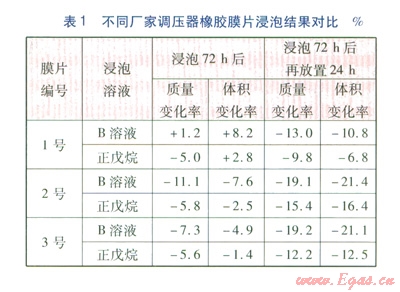 液態(tài)正戊烷對(duì)橡膠膜片的腐蝕性低于B溶液。為了驗(yàn)證液態(tài)正戊烷和B溶液對(duì)橡膠膜片腐蝕程度的差異性,國家燃?xì)庥镁哔|(zhì)量監(jiān)督檢驗(yàn)中心財(cái)3個(gè)不同調(diào)壓器廠家的橡膠膜片(分別編號(hào)為1號(hào)、2號(hào)和3號(hào))按照標(biāo)準(zhǔn)中規(guī)定的試驗(yàn)方法,分別采用液態(tài)正戊烷和B溶液進(jìn)行浸泡,浸泡結(jié)果見表1。