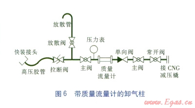 對于在卸氣柱上增加質(zhì)量流量計的工藝。是從CNG加氣機(jī)的工藝流程借鑒過來的,還應(yīng)該在流量計之前增加壓力表,為卸氣柱增加一個箱體,另外,拉斷閥、單向閥(此處的單向閥還有防止管道氣逆流時,保護(hù)質(zhì)量流量計的作用)必須加裝。帶質(zhì)量流量計的卸氣柱見圖6。