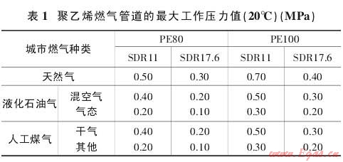 1.2.2 在聚乙烯燃?xì)夤艿赖膲毫υO(shè)計(jì)中,還需要考慮到燃?xì)庵兴姆枷銦N類(lèi)物質(zhì)所產(chǎn)生的影響,以及管道的施工條件等因素,根據(jù)國(guó)家相關(guān)的行業(yè)標(biāo)準(zhǔn),聚乙烯燃?xì)夤艿涝试S的最大工作壓力如表1。