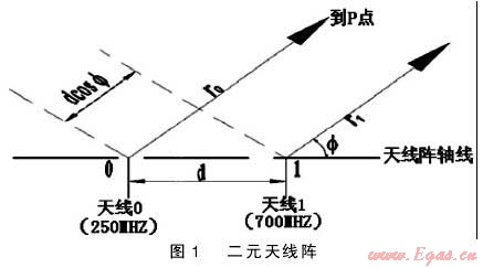 1為一個二元天線陣的示意圖,天線0同天線1均為偶極子天線,只是天線0250MHz,天線1700MHz。它們的取向(排列方向相同),兩天線間的距離為d,它們到觀察點p的距離分別為r0r1,由于觀察點很遠,r0r1可看成平行。在計算兩天線到p點的相位差時,可近似令r0r1,但計算兩天線到P點的相位時,應采用較為準確的關系式r1=r0-dcosφ,當兩天線電流大小和相位關系為I1=mI0e-ja(ma為常數(shù)),天線1的輻射波在到達p點時將較天線0的輻射波超前相位φ=kdcosφ-a,等式右邊第一項是由兩天線的相對位置引起的;第二項是由兩天線電流的相對相位引起的。φ是天線陣由天線0到天線1(由電流超前引向電流滯后)的軸線沿著逆時針方向旋轉(zhuǎn)到指向觀察點的射線夾角。如果天線0p點產(chǎn)生的場強是E0,則由于電場強度正比于電流的一次方,故天線1p點產(chǎn)生的場強應為E1=mE0ejφ,于是合成場強是E=E0+E1=E0(1+mjφ)可以看到,合成電場是由兩部分相乘求得的,第一個因子E0是天線0單獨產(chǎn)生于p點的場強,由天線0的類型(更確切的就是它的電流分布)決定;第二個因子(1+mejφ)只依兩天線之間電流比值和它們相互位置而定,與天線類型無關,這一因子稱為陣因子。因此,由相同兩天線構(gòu)成的天線陣,它的合成方向圖是單獨一付天線的方向圖乘上因子。