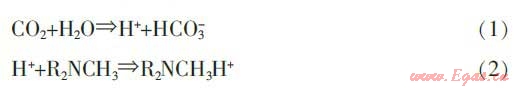 混合胺溶劑可以彌補(bǔ)大量脫除CO2時MDEA溶液的不足。純MDEA溶液與CO2不發(fā)生反應(yīng),但其水溶液與CO2可按式(1)~(2)反應(yīng):