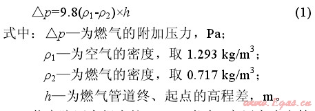 民用天然氣燃具的額定壓力pn=2000Pa,燃具前壓力應(yīng)在(0.75~1.5)pn范圍內(nèi)波動(參見《城鎮(zhèn)燃?xì)庠O(shè)計(jì)規(guī)范》(GB50028—2006))。當(dāng)天然氣壓力超出此范圍,燃具的熱效率降低,燃燒不穩(wěn)定,燃燒噪聲大,出現(xiàn)脫火或者回火等現(xiàn)象。目前,安陽市高層建筑的燃?xì)庠O(shè)計(jì)主要采用低壓入戶,在計(jì)算低壓燃?xì)夤艿赖膲毫p失時(shí),應(yīng)考慮因建筑高度而引起的燃?xì)飧郊訅毫Α?/span>p,計(jì)算如下:
