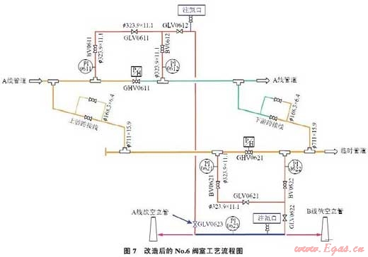 對No.6閥室進行工藝改造,增加二級節(jié)流,通過兩級降壓解決節(jié)流降溫和振動問題。利用DN300管道將兩閥室的放空口進行連接(圖7藍色線條部分),并加裝2個注氮閥,加裝1臺節(jié)流截止放空閥GLV0623和1個壓力表。為解決節(jié)流造成的振動對放空管道的影響,在GLV0612和GLV0622節(jié)流截止放空閥之間的放空管道加裝壓重塊,然后回填并夯實。