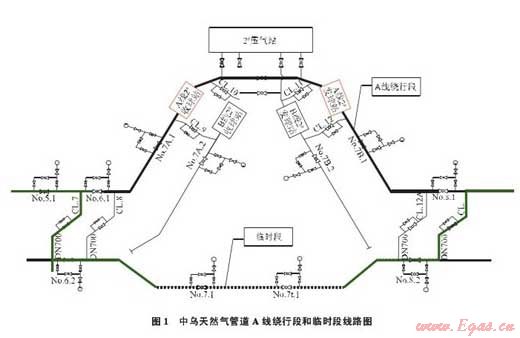 A線繞行段是改變原有中烏天然氣管道設計線路向西繞行至烏茲別克斯坦加茲里氣田區(qū)的一項關鍵性工程,如果不采取非常措施,按期實現中烏天然氣管道A線單線投產通氣難度極大。為此,采用了通過臨時段管道連通A線管道先實現投產,待A線繞行段具備投產條件后,再將其與A線管道連通,最終實現A線管道投產、臨時段管道停用的總體方案。