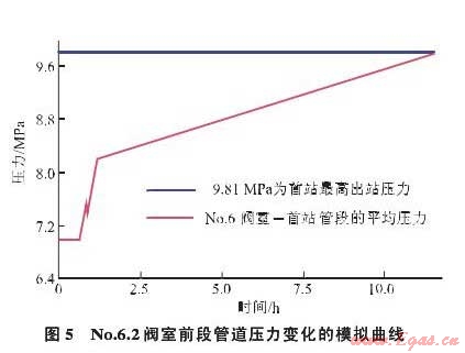 根據No.6.2閥室前段管道平均壓力8MPa和中烏管道首站進口流量600萬m3/h的工況進行模擬計算,在首站壓縮機組不停機的情況下,No.6.2閥室關閉約6h后,該閥室上游管道平均壓力達到9MPa;約11h后,該閥室上游管道平均壓力達到9.8MP(a圖5)經過計算得出,約9h后,首站壓縮機組因出口壓力達到9.8MPa而停機,進而使阿姆河氣田外輸站壓縮機組停機,影響上游的正常運行。為了安全起見,可以按No.6.2閥室上游管道平均壓力達到9MPa時的6h作為平壓作業(yè)的實施時間。
