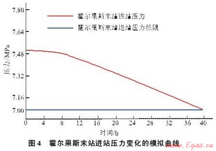 根據中亞天然氣管道霍爾果斯末站的進站壓力7.5MPa和出口流量700萬m3/h的工況進行模擬計算,No.8.2閥室關閉36h后,霍爾果斯末站進站壓力降到7.1MPa(圖4),即No.8.2閥室關閉36h后將影響到下游正常運行。