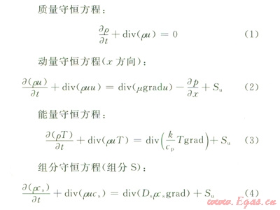 CFD可以看作是在流動基本方程(質(zhì)量守恒方程、動量守恒方程、能量守恒方程)控制下對流動數(shù)值的模擬。通過這種數(shù)值模擬,可以得到極其復(fù)雜問題的流場內(nèi)各個(gè)位置上基本物理量(如速度、壓力、溫度、濃度等)的分布,以及這些物理量隨時(shí)間的變化情況。由于含硫天然氣是混合物質(zhì),因此,控制方程還應(yīng)包括組分守恒方程。4個(gè)方程的表達(dá)式如下。