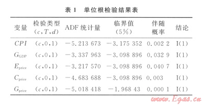 表1中,檢驗類型(c,T,d)分別代表所檢驗的序列中含有截距、時間趨勢以及滯后階數(shù);按AIC準(zhǔn)則確定滯后階數(shù)。結(jié)果表明,CPI、GGDP、Eprice、Cprice、Gprice的水平值都是非平穩(wěn)的,但其一階差分是平穩(wěn)的(ADF檢驗即增廣迪基-福勒檢驗,其統(tǒng)計量的絕對值大于臨界值的絕對值,表示變量平穩(wěn)),因此,這5個變量序列都是在95%置信水平下的一階單整序列[表