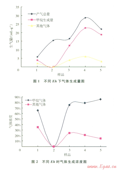 筆者在實驗室條件下模擬了不同Eh條件下生物甲烷生成的情況,對不同條件下產(chǎn)出的氣體及甲烷含量進行分析,并對甲烷在不同反應階段的生成方式進行了探討,實驗結果表明: