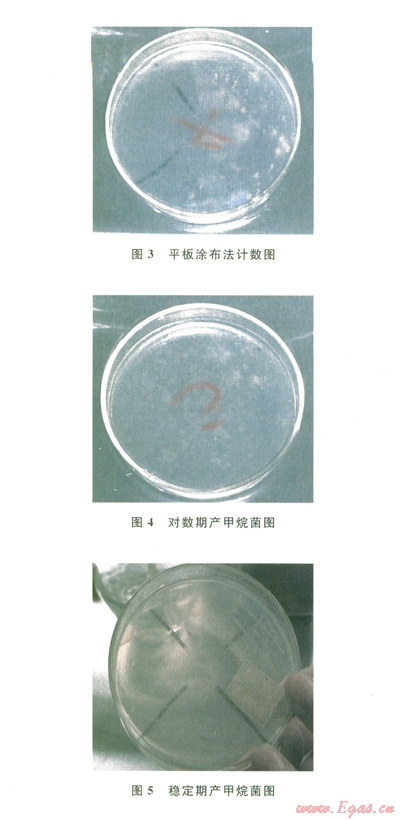 微生物的生長特性與生物甲烷的產(chǎn)出過程密切相關的:經(jīng)過厭氧處理,放入37℃的恒溫培養(yǎng)箱;大約7 d細菌開始適應繁殖并逐漸生長,如圖4星點狀的細菌分布;再經(jīng)過30 d左右進入對數(shù)生長期后,細菌的生長速度增至最大,細菌數(shù)量以幾何級數(shù)增加,細菌數(shù)逐漸連成一片,由于細菌的快速繁殖消耗了大量的營養(yǎng)物質(zhì),致使培養(yǎng)基濃度降低,進入穩(wěn)定期。穩(wěn)定期的細菌總數(shù)達到最大值,并恒定一段時間,從圖5可看出呈樹枝狀的為穩(wěn)定期,新生的細菌數(shù)和死亡的細菌數(shù)相當。繼穩(wěn)定期之后,大約60 d培養(yǎng)基營養(yǎng)成分被耗盡,細菌因缺乏營養(yǎng)而利用儲存物質(zhì)進行內(nèi)源呼吸,死菌數(shù)大于新生菌數(shù),細菌群體進入衰亡期。試驗圖示證明:整個產(chǎn)甲烷過程也是微生物生長代謝的過程。