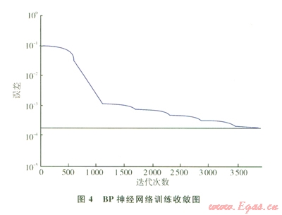 由圖4可知BP神經(jīng)網(wǎng)絡(luò)的收斂性良好,說(shuō)明程序的下一步預(yù)測(cè)有效。表3為BP神經(jīng)網(wǎng)絡(luò)預(yù)測(cè)值與實(shí)際值的對(duì)比和誤差。