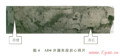 塔河油田l2區(qū)探井AD4井,處于構(gòu)造洼地,AD4井南面發(fā)育有東西向斷裂,東面發(fā)育有南北向斷裂。地震資料顯示井區(qū)T47界面附近有強(qiáng)振幅串珠狀異常反射(3)。振幅變化率處理成果統(tǒng)計分析表現(xiàn)為強(qiáng)振幅變化率,相干屬性為較弱相干。鄰井鉆井完井資料顯示,7 口井中有2口在奧陶系一問房組發(fā)生漏失(其中TKl013井共漏失鉆井液905 m3,溢流153.55 m3),2口在恰爾巴克組發(fā)生漏失。鄰井巖心分析顯示,巖石主要成分為泥微晶顆?;?guī)r,測試顯示供液能力50 m3d左右。