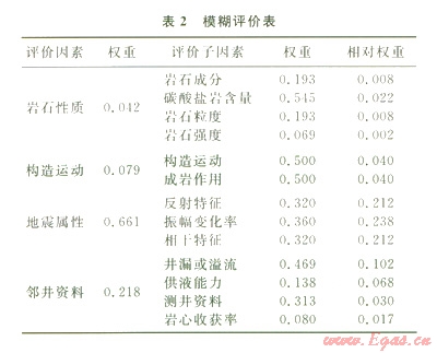 其中,巖石性質(zhì)包括巖石組分、巖石結(jié)構(gòu)、巖石強(qiáng)度,是最基礎(chǔ)的參數(shù)。地質(zhì)構(gòu)造因素分為構(gòu)造運動及后期的成巖作用;地震屬性選取對井漏漏失通道檢測較敏感的反射特征、振幅變化率、相干特性;鄰井資料包括已發(fā)生漏失井的井漏狀況、供液能力及測井資料(漏失井測井資料上反應(yīng)的參數(shù)),屬于評判系統(tǒng)的低層次指標(biāo)。