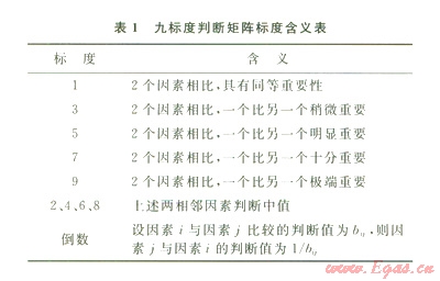 采用九標(biāo)度法(1),對每一結(jié)構(gòu)層次內(nèi)各因素兩兩比較其重要性,并把比較結(jié)果通過合適的標(biāo)度表示出來,寫成矩陣形式,即為判斷矩陣。