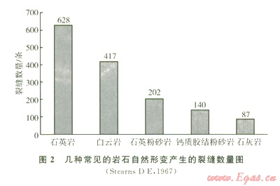 巖石在構(gòu)造應(yīng)力作用下會發(fā)生變形,當(dāng)變形超過破裂強(qiáng)度時巖石將發(fā)生破碎,產(chǎn)生裂縫。不同的巖石在相同的應(yīng)力作用下形變不同,產(chǎn)生的裂縫數(shù)也不相同,即強(qiáng)度決定巖石裂縫的多少(2)。