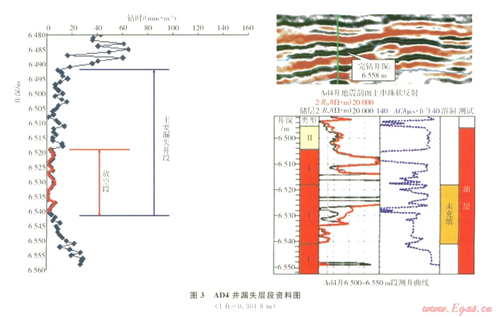 鉆井完井過程中,在奧陶系一間房組6 486.02 m發(fā)生井漏,在鉆進(jìn)過程中發(fā)生間斷性漏失。其中6 491.866 541.0 m段為主要井漏段,其中6 518.006 541.00 m段強(qiáng)行鉆進(jìn)過程中,鉆壓060 kN,鉆進(jìn)液漏失速率4460 m3h,鉆時一般維持在25minm,部分井段鉆時1 minm,故認(rèn)為此段為放空段,漏失段長23 m。隨后發(fā)生多次溢流,經(jīng)多次壓井才順利完鉆,共漏失鉆井液7 042 m3。最大漏速70 m3h,平均漏速40.9 m3h。地震、測井資料均顯示此段漏失嚴(yán)重(3)。