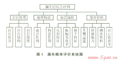根據(jù)井漏漏失通道的影響及反應(yīng)特征,建立了評價系統(tǒng)(1)。圖l的巖石性質(zhì)、地質(zhì)構(gòu)造、地震屬性、鄰井資料是綜合評判系統(tǒng)的高層次指標(biāo)。