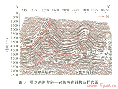 南緣沖斷帶霍、瑪、吐構(gòu)造深層發(fā)育三角楔構(gòu)造。圖3為過霍爾果斯與安集海背斜的一條區(qū)域剖面。霍爾果斯背斜深部的構(gòu)造三角楔由霍安斷裂與一個(gè)反向沖斷層組成。沿中下侏羅統(tǒng)發(fā)育的滑脫斷層向上突破白堊系,再沿白堊系滑脫,前鋒向上突破控制了北部安集海背斜中淺層背斜特征?;舭矓嗔言诨魻柟贡承毕蛏贤黄瓢讏紫档倪^程中(前沖斷層),同時(shí)伴生一個(gè)反向的沖斷層(反沖斷層),形成霍爾果斯背斜深部構(gòu)造三角楔??梢钥闯鰳?gòu)造三角楔前端向斜軸面位置與三角楔前緣端點(diǎn)位置一致,符合構(gòu)造三角楔幾何變形原理。