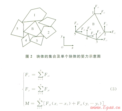 式中Fx、Fy分別為x、y方向上的合力;M為合力矩。其中(x0,y0)為塊體B質(zhì)心坐標,力矩以逆時針方向為正。對公式(3)求導可以得出塊體質(zhì)心的運動方程,對質(zhì)心的運動方程進行向前差分格式數(shù)值積分可以得到巖塊質(zhì)心沿xy方向的速度和位移。