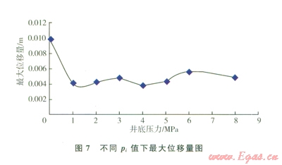 由位移矢量圖可見,井底壓力在0 MP。時位移變化最大,隨后開始減小,到5 MPa后又明顯增大,取出各pi值時最大位移量進行比較有如圖7關系。
