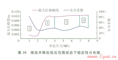 從圖上可見,在0l MPa兩種狀態(tài)中,塊體安全系數(shù)均小于20%,而塊體的安全系數(shù)在28 MPa幾種狀態(tài)下都超過78%,所以在這些壓力狀態(tài)下井壁更加穩(wěn)定。將最大位移與安全系數(shù)分布進行耦合,得出煤層在低壓范圍內(nèi)最佳穩(wěn)定區(qū)間(10)