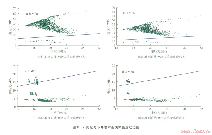 從圖7上可見,隨著pi值增大井壁附近最大位移逐漸減小,去除誤差影響,認為隨著壓力增加,井底壓力對煤層井壁支撐作用加強,而這種支撐作用保持一定水平,pi值在18 MPa范圍內(nèi),最大位移變化區(qū)間為0.0040.006 m,僅從這個角度講,只能說明整個塊體的位移分離情況,并不知道各個塊體是否已經(jīng)產(chǎn)生破壞,所以下面對各個狀態(tài)進行定量判斷塊體單元強度情況。
