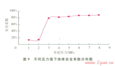 上述分析可見,在0 MPa1 MPa時候井眼附近塊體失效較多,隨著壓力增加,塊體失效數(shù)目逐漸減少。將上述各狀態(tài)中總的塊體數(shù)N除以未失效塊體數(shù)n的比值設為安全系數(shù),從而得出以下關系,如圖9所示。