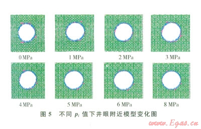 由圖5模擬結(jié)果顯示,改變井眼有效壓力值pi井眼形狀未發(fā)生較大變化,井眼形狀保持完好(圖中藍色區(qū)域),說明井壁未出現(xiàn)明顯垮塌或縮徑,只是局部塊體發(fā)生分離(圖中紅色區(qū)域),節(jié)理間距略有變化。
