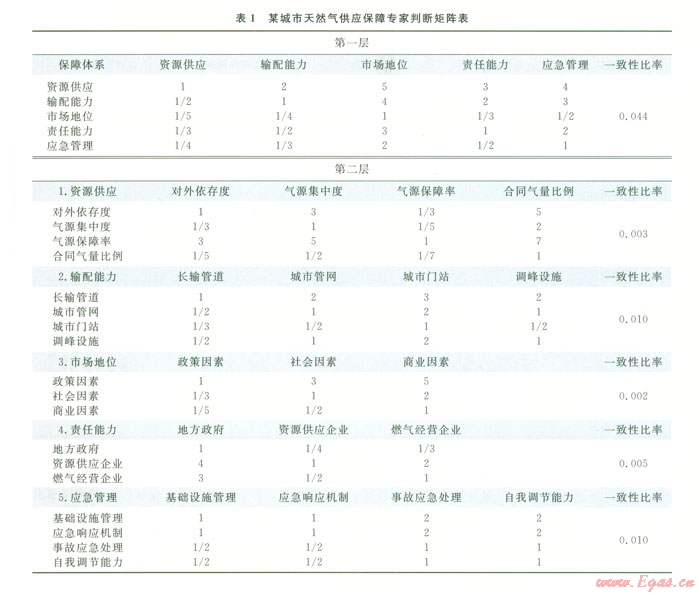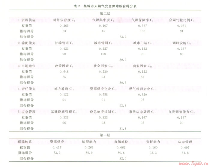 本文從天然氣產(chǎn)、運、銷物流系統(tǒng)整體出發(fā),同時納入“政府、企業(yè)、用戶”三方責任承擔與應急管理評價指標,形成一套城市供氣安全的綜合保障評價體系。同時采用成熟的層次分析法建立數(shù)學模型,分別計算指標權(quán)重與模型得分,定性分析和定量計算相結(jié)合,對城市的供氣保障形成直觀認識。計算實例表明,模型在分析影響城市供氣安全不利因素、提高認識的準確水平,以進一步增強城市供氣保障措施和安全系數(shù),具有一定的輔助分析作用。