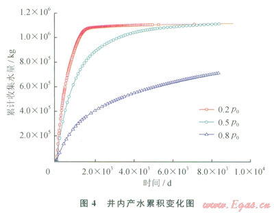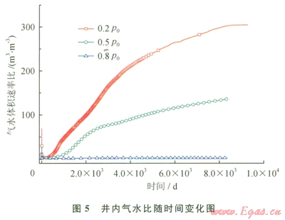 從上述研究成果町以得出,在0.2p0條件下,水合物藏中水合物全部分解,井內(nèi)收集到3.4×105m3的氣體。圖40.2p042℃,0.5p0、42℃,0.8p0、42℃3種條件下,井內(nèi)收集水的累積變化圖。從圖4中可以看出,產(chǎn)水集中在開采前期1500d,后期產(chǎn)水速率小。在0.5p0、42℃,0.8p042℃條件下,也有較大量的水被收集,表明也有較大量的水合物被分解了。圖5為整個(gè)開采過程中3種條件下,井內(nèi)氣水比隨時(shí)間的變化圖。從圖5可以看出,0.2p0、42℃條件下,氣水比一直在增加,最大值達(dá)到304;而0.5p0、42℃條件下,氣水比增加緩慢,最大達(dá)到136;0.8p0、42℃條件下氣水體積比一直接近0,開采后期也沒有改善??梢钥闯?,在井內(nèi)壓力高時(shí),井和物藏間的壓差不夠大,整個(gè)開采過程,分解后的自由氣并沒有大量流人開采井內(nèi)??梢姕p壓驅(qū)動(dòng)力對(duì)于分解后自由氣在井內(nèi)的收集非常重要。物藏和井之間壓差太小,自由氣一直留在物藏內(nèi),無法在井內(nèi)被收集。