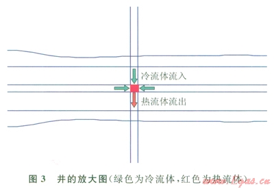 式中A1表示導(dǎo)熱面積0.4m2(井左右網(wǎng)格對(duì)井導(dǎo)熱距離大,其導(dǎo)熱熱流忽略);l表示導(dǎo)熱系數(shù),其中lrock表示地層骨架(沙石)導(dǎo)熱系數(shù),3.1W(m·K),占0.6的空間,有效導(dǎo)熱系數(shù)為1.86W(m·K),lrock表示水的導(dǎo)熱系數(shù)0.58W(m·K),孔隙度為0.4,飽和度為0.5,有效導(dǎo)熱系數(shù)為0.12W(m·K);DT表示井和其周圍網(wǎng)格間溫差,來自模擬結(jié)果文件;L表示導(dǎo)熱距離0.35m,井中心到上下網(wǎng)格中心距離。