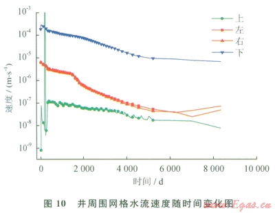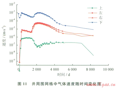 孔隙滲透換熱能夠?qū)⒛芰總魅宋锊?。圖l0為井周圍網(wǎng)格水流速度隨時(shí)間的變化圖。左、右和下表示網(wǎng)格中水流向井內(nèi),而上則表示井從上流入其正下方網(wǎng)格。圖10中下表示正上方網(wǎng)格流人下方井內(nèi)水流速率,也就是圖10表示的曲線,該速率遠(yuǎn)高于其他3個(gè)方向的速率。圖ll為井周圍網(wǎng)格中氣體速率隨時(shí)間變化圖。同樣是上方網(wǎng)格流向正下方井內(nèi)氣體速率最大,也就是圖ll表示的曲線。氣流和水流的速率數(shù)量級(jí)均為l04ms。由于甲烷氣導(dǎo)熱系數(shù)約為0.03W(m·K),遠(yuǎn)低于液態(tài)水的導(dǎo)熱系數(shù),其換熱可以不計(jì)算,這里只計(jì)算水的對(duì)流。