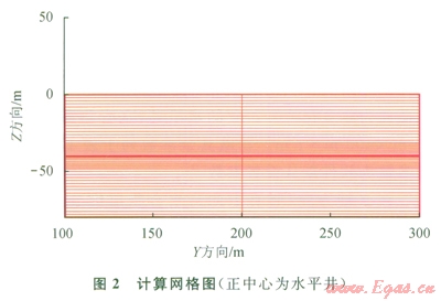 Z軸方向(豎直方向),水合物層細(xì)分為Dz=0.2-1m的網(wǎng)格。而上下層在Z方向上,單個(gè)網(wǎng)格lm2m,Z方向共離散成55個(gè)間隔。在Y方向(寬度方向),400m被分為3個(gè)網(wǎng)格,兩側(cè)網(wǎng)格均為l99.9m,中間網(wǎng)格為0.2m,用做開采井。X方向?yàn)?span lang="EN-US">1m單個(gè)網(wǎng)格??偩W(wǎng)格數(shù)為l65(55×3)。最頂層和最底層的6(3×2)個(gè)網(wǎng)格作為邊界網(wǎng)格(恒溫、恒壓),離散所得的網(wǎng)格如圖2所示。開采井在網(wǎng)格正中心,圖3為井的放大圖,圖3中示意了流體流向。井內(nèi)溫度壓力條件根據(jù)模擬需要進(jìn)行相應(yīng)設(shè)置。井溫度設(shè)定為42(恒溫),壓力設(shè)置為0.2P00.5P0、0.8P0 (恒壓)3個(gè)級(jí)別進(jìn)行模擬開采。