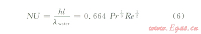 式中NU表示努賽爾數(shù);h表示換熱系數(shù);l表示特征長(zhǎng)度0.33m4倍面積除以潤(rùn)周得到特征長(zhǎng)度;lwater表示水的有效導(dǎo)熱系數(shù),0.12W(m·K);Pr表示普朗特?cái)?shù),取飽和水40℃時(shí)的值;Re表示雷洛數(shù)。