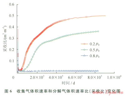 如果水合物已經(jīng)分解,分解氣體不能夠流入井內(nèi)被順利收集,那么這種技術(shù)就沒有任何經(jīng)濟(jì)價(jià)值和意義。因此井中的流體流動(dòng)對(duì)水合物的開采是非常重要的。圖63種開采條件下,井內(nèi)收集氣體積速率和水合物分解氣的體積速率比(采收比)隨時(shí)間的變化圖。在開采初期,水合物分解速率大,分解氣體積速率也大,而井內(nèi)收集速率較小,所以采收都比較低。而在開采后期,分解氣體積速率小,收集速率比較平穩(wěn),所以開采后期采收比根據(jù)井和物藏間壓差不同而變化較大。在0.2P0、42℃情況下,采收比在開采1000d左右增加到0.3,而0.5P042℃情況下,則在2000d左右才達(dá)到0.3,而0.8P042℃條件下,采收比始終接近于0。水合物藏總含氣量為6.8×105m3,0.2P0、42℃條件下,井內(nèi)氣體累積收集量為34×l05 m3,總采收率為0.5。當(dāng)氣體收集到2.1×105m3,總的采收率約為0.3,0.8P042℃條件下,總采收比接近0。由此可以看出,減壓驅(qū)動(dòng)力對(duì)采收比也有著非常大的影響。