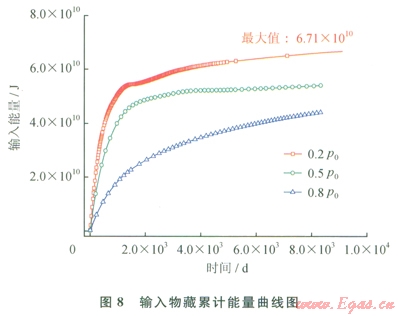80m×400m×1m水合物藏開采模擬所得數(shù)據(jù),結(jié)合開采物藏和井的參數(shù),可計(jì)算減壓和加熱對(duì)水合物分解的貢獻(xiàn)。水合物藏中水合物總質(zhì)量為3.6×106kg。由式(2)可得,完全通過加熱熔化需要能量1.27×1012J。圖7為井流向物藏的熱流隨時(shí)間變化圖。對(duì)圖7熱流進(jìn)行積分,得到輸入物藏累計(jì)能量變化曲線(8)。在0.2P0、42℃條件下,輸人物藏的能量最大,為6.71×1010J。井內(nèi)溫壓條件為0.5P0、42℃時(shí),輸入物藏的能量為5.39×1010J,0.8P0、42℃時(shí),輸人物藏能量為4.39×1010J。由式(1)可得,在0.2P、42℃條件下,加熱分解了5.28%的水合物,其余的水合物由減壓驅(qū)動(dòng)力所分解。而在另外兩種井內(nèi)溫度壓力條件下,加熱分解的水合物量多一些,而減壓所分解的水合物量相比更少一些。