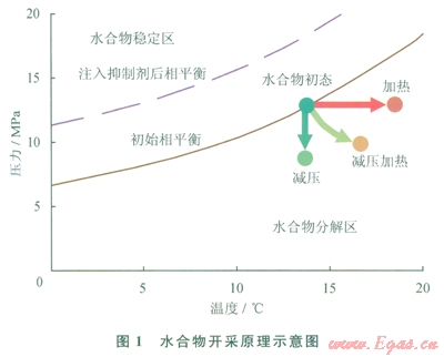 井的高溫和低壓條件將促使水合物分解。同時(shí),多孔介質(zhì)中的水合物的分解將提高物藏的流動(dòng)性,進(jìn)而促進(jìn)降壓和加熱驅(qū)動(dòng)力分解水合物的效果,使得水合物藏進(jìn)一步分解,從而形成良性循環(huán)。這樣將使更多的水合物分解,最終達(dá)到開采目的。