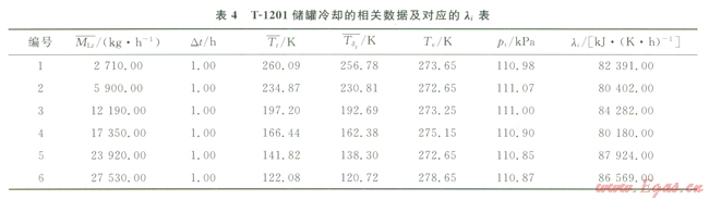 16×104m3常壓全容式混凝土頂儲(chǔ)罐的結(jié)構(gòu)及保溫材料都是相同的,因此,以大連LNG接收站T-1201儲(chǔ)罐冷卻時(shí)的數(shù)據(jù)來確定l。l同時(shí)也可作為模型的一個(gè)修正參數(shù),使所建立的模型更符合冷卻時(shí)的實(shí)際情況。表4為T-l201儲(chǔ)罐冷卻的相關(guān)數(shù)據(jù)及對(duì)應(yīng)的l值。