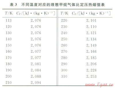 對(duì)于hBt的確定,首先通過EPCON Engineer′s Aide Toolbox 7.0軟件查詢出理想甲烷氣體不同溫度時(shí)所對(duì)應(yīng)的比定壓熱熔Cp(表3),再運(yùn)用matlab擬合出Cp與T的關(guān)系函數(shù)。