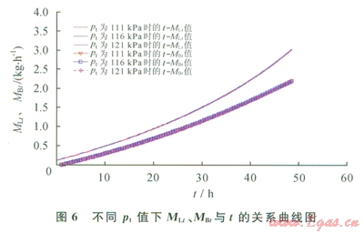 式中Mdt為(t+dt)時(shí)刻儲(chǔ)罐內(nèi)BOG質(zhì)量,kg;Mt為t時(shí)刻儲(chǔ)罐內(nèi)BOG質(zhì)量,kg;pt為儲(chǔ)罐的絕對(duì)壓力,kPa;V為儲(chǔ)罐的容積,m3;Mmol為罐內(nèi)BOG的摩爾質(zhì)量,g/mol;R為摩爾氣體常數(shù),8.315J/(mol·K)。
