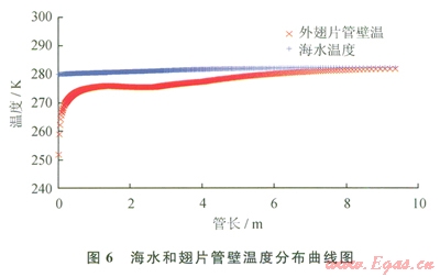 6給出了整個換熱管上翅片管壁和海水的溫度分布曲線。海水流量較之LNG流量大得多,所以其溫度變化不大。在1m以下的位置,管壁的溫度急劇降低,甚至低于冰點,很容易導致靠近壁面的海水結(jié)冰。該區(qū)域確實也是結(jié)冰情況較嚴重的區(qū)域。