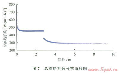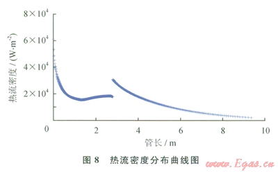 7、8分別給出了反映SuperORV整體換熱性能的總換熱系數(shù)和熱流密度的分布曲線??梢钥吹?,在氣化段和加熱段過渡區(qū),2條曲線都出現(xiàn)了跳躍。這是由于SuperORV結(jié)構(gòu)上的變化引起的。圖7中,氣化段的總換熱系數(shù)總體優(yōu)于加熱段的總換熱系數(shù)。圖8中,加熱段開頭的熱流密度先高于氣化段末尾的熱流密度而后逐漸下降,這是由NG流體混合前后的溫度變化引起的,從氣化段出來的2個流道里的流體混合后導致溫度有大的下降,而后隨著加熱溫度又逐漸上升。