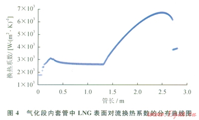 4給出了氣化段內(nèi)套管中LNG表面對流換熱系數(shù)的分布曲線,圖5給出了內(nèi)套管壁及其兩側(cè)流體的溫度分布曲線。從圖4可以看出,飽和沸騰區(qū)的傳熱系數(shù)有一個很大的提升,正是南于這個原因,圖5中內(nèi)套管的壁溫會有所下降,而偏向低溫流體。在缺液區(qū),圖4曲線上出現(xiàn)了較大的下降臺階,這是由擘面被蒸干所導致的傳熱性能下降而引起的,可以看到,與其對應的圖5中的內(nèi)套管壁溫也有一個明顯的上升。環(huán)狀間隙里的NG流體的溫度在0.5m之后保持在了一個較穩(wěn)定的溫度位上,這也是SuperORV利用環(huán)隙中的NG進行保溫,緩解了結(jié)冰狀況的依據(jù)。