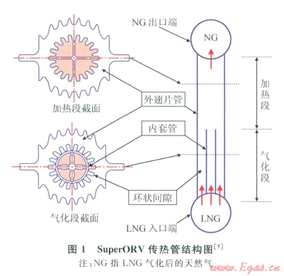 我國先前建成的粵東LNG接收終端以及其他一些在建的LNG接收終端項目多采用的是傳統(tǒng)的ORV[3-6],而日本和歐洲的LNG接收終端早在2005年以前都已大量采用SuperORV作為基本負荷型氣化設備(1) [7]。未來中國將會大量建設LNG接收終端[8-9],但國內(nèi)對該裝置傳熱性能的研究目前還不是很多。為此,筆者擬對SuperORV關鍵傳熱單元傳熱管的換熱過程進行數(shù)值模擬,并對模擬結(jié)果反映的氣化器性能進行分析和討論,期望能為該類型氣化器的設計、選型和運行管理提供參考。