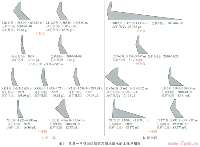 須四段的地層水相圖(圖1)表明地層水分布橫向連通性差,下亞段新場、豐谷地區(qū)各不相同,但各構(gòu)造部位縱向上地層水相圖有一定的相似性。新場地區(qū)XC22井下亞段與X882井上亞段地層水相圖特征相似,豐谷地區(qū)CF563中亞段與CFl75下亞段相岡特征相似。X882井區(qū)斷層發(fā)育,而豐谷地區(qū)斷層不發(fā)育,可見須四段氣水運移不僅依靠斷層、裂縫等快速通道,同時存在垂向運移。