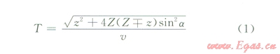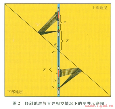 2顯示了傾斜地層與直井相交情況下的測井。由傾斜地層產生的反射波按照傳播方向可分為上行反射波和下行反射波。設地層與井的夾角是a,反射波旅行時表達式為: